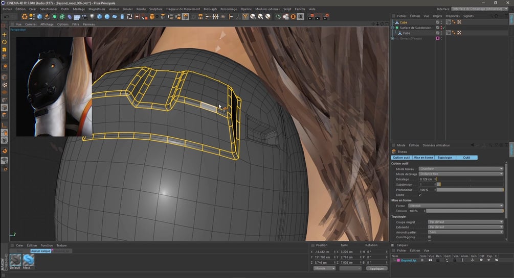 All the modeling is done in Cinema4D. Here we don't model the character, only all the armors part. I'll show you my workflow for model Hard Surface stuff in C4D based on my Maya knowledge. We will model 3 pieces (arm, shoulder and visor) using various tools and techniques like knife, boolean, retopo, pen tool...